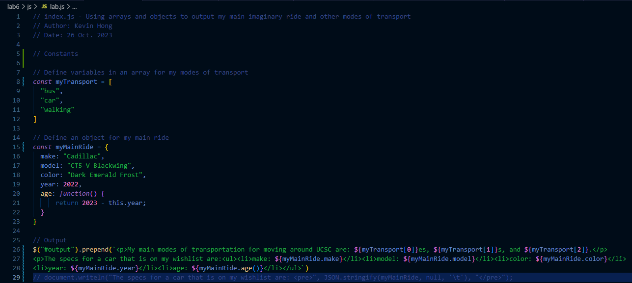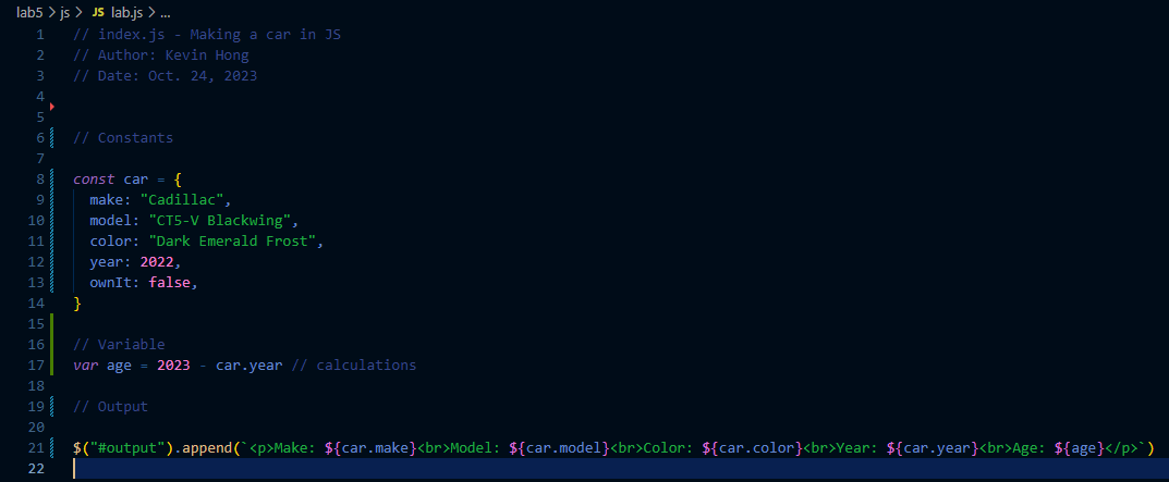 In the following screenshots, I reworked my lab 5 JavaScript code. There wasn't necessarily anything wrong with it, but I felt like there was a better way to do it than document.writeln(). As you can see, what I first did was turn the car into an object and put the attributes into it (I didn't realize then that I had already did this for the next lab; I forgot). I then used jQuery to append a paragraph using template literals. This allowed me to easily print what I wanted while also simplifying the method of doing it. Overall there were not many drastic changes, just simple fixes.