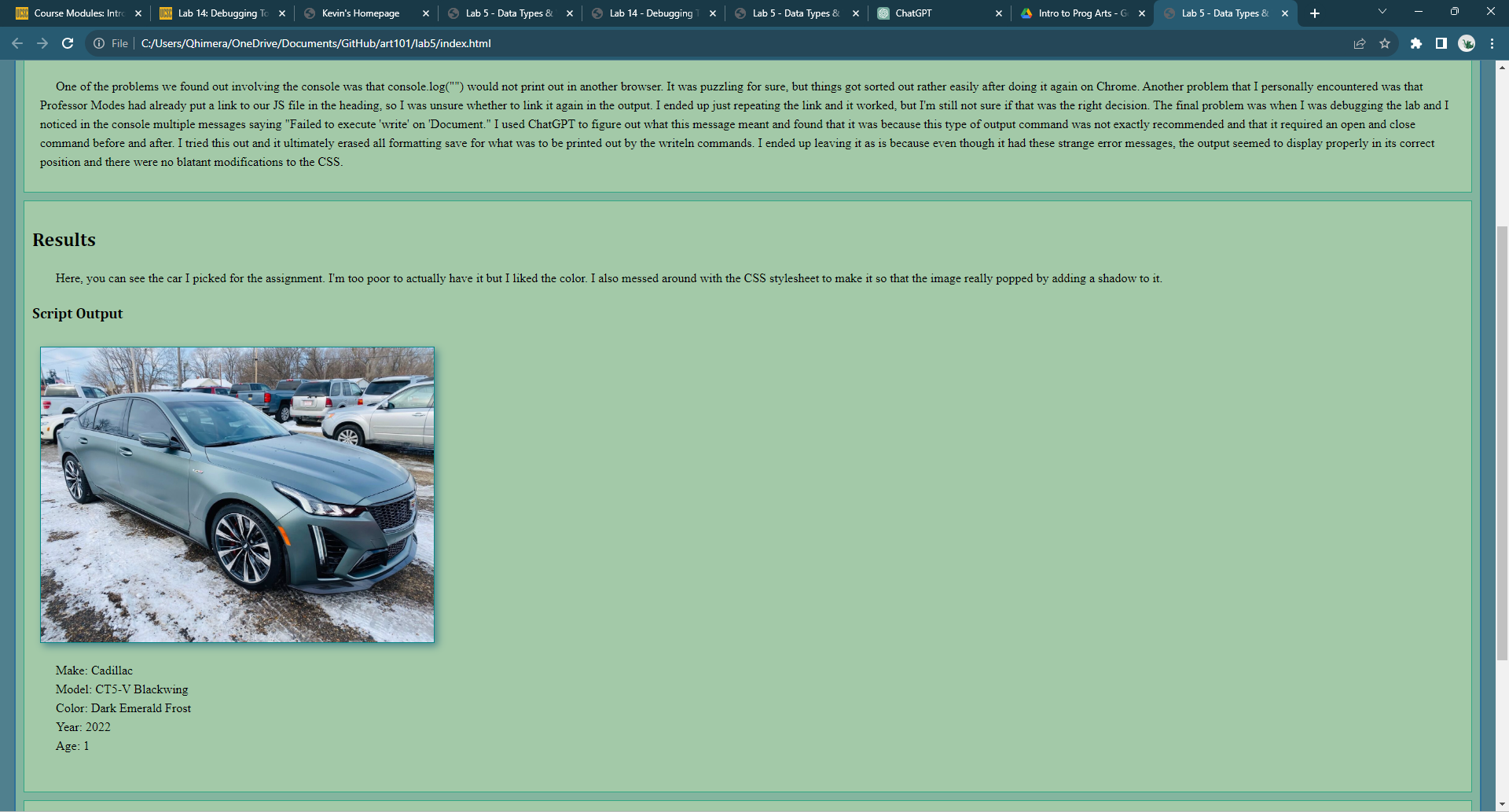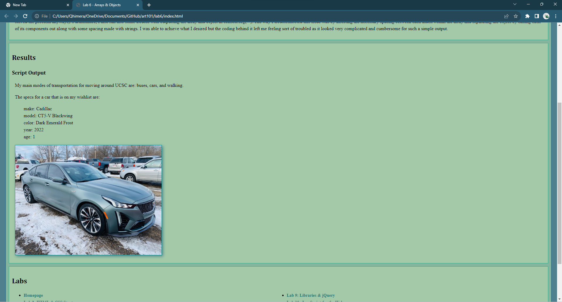 For lab 6, all I did was replace document.writeln() again with template literals. I modified the code for the car's attributes that was using pre by using unordered lists instead. Overall, there were not many changes at all.
